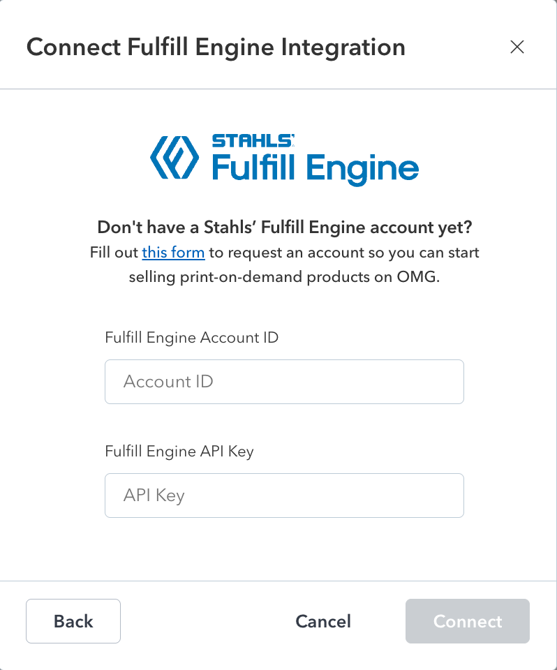 The integration between Order My Gear and STAHLS' Fulfill Engine operates based off a connection between an OMG Account, and a single Account within Fulfill Engine. This does not limit an FE Account from also pulling in volume from white-label, Shopify, or any other supported integration.