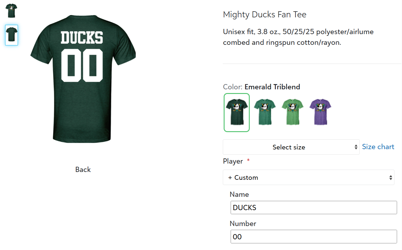 - Today, you'd pay $16 for the 'DUCKS 00' customizations on the back -- $8 per customization, 2 customizations (name, number).