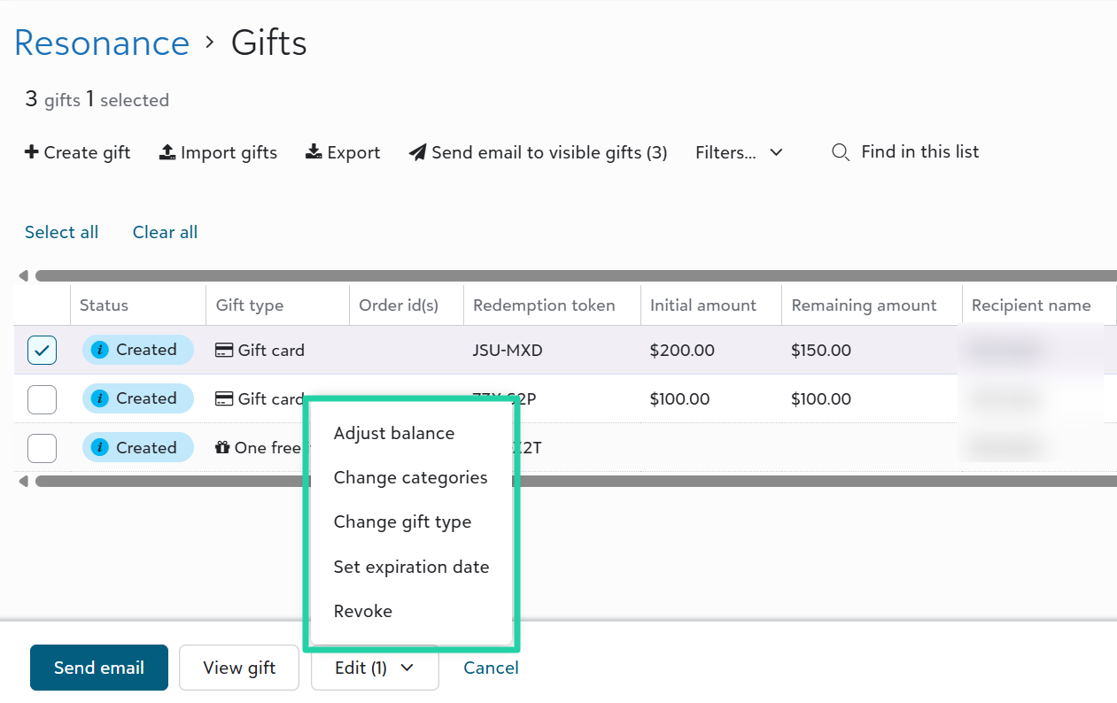 Edit a gift's key details, including the balance, categories, gift type, and expiration date.