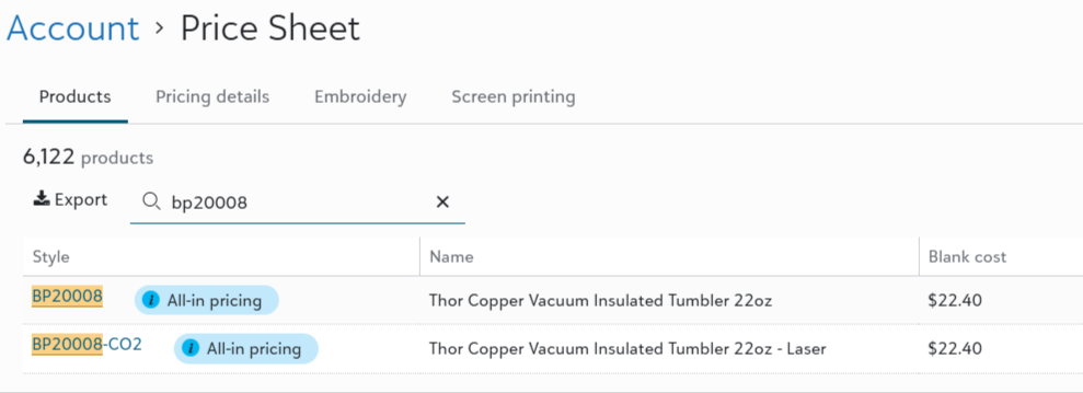 Spoke Custom products follow an all-in pricing model, meaning the item costs don't include separate lines for the blank good and decoration. You only pay the blank cost.