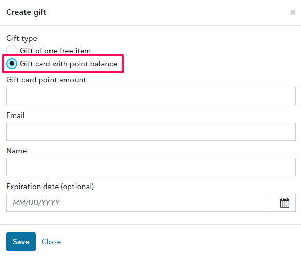 When adding a gift, you will select Gift card with point balance. Once saved, it will send a unique redemption token to the recipient.