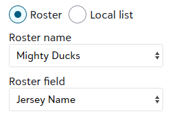 If you'd like to limit customization to only your roster entries, select Static values as the customization type or if you'd like to pair your roster with customer personalization, select Static values with personalization. Once you choose one of those two types, you'll see radio options for Roster or Local list appear. Roster will be selected by default and allow you to choose a roster from your store and connect the customization to Jersey Name, Number, or Team (images only). The field you connect your customization to will be the information that is added to the product when a roster member is chosen in the storefront.